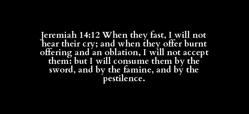 Jeremiah 14:12 When they fast, I will not hear their cry; and when they offer burnt offering and an oblation, I will not accept them: but I will consume them by the sword, and by the famine, and by the pestilence.