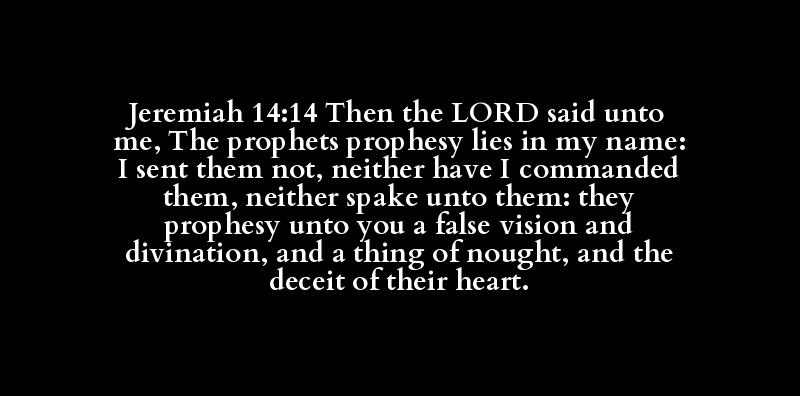 Jeremiah 14:14 Then the LORD said unto me, The prophets prophesy lies in my name: I sent them not, neither have I commanded them, neither spake unto them: they prophesy unto you a false vision and divination, and a thing of nought, and the deceit of their heart.