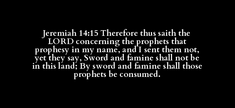 Jeremiah 14:15 Therefore thus saith the LORD concerning the prophets that prophesy in my name, and I sent them not, yet they say, Sword and famine shall not be in this land; By sword and famine shall those prophets be consumed.