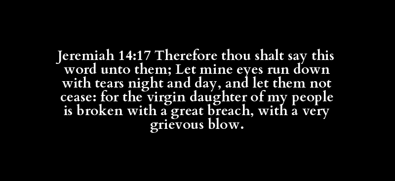 Jeremiah 14:17 Therefore thou shalt say this word unto them; Let mine eyes run down with tears night and day, and let them not cease: for the virgin daughter of my people is broken with a great breach, with a very grievous blow.