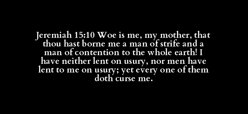 Jeremiah 15:10 Woe is me, my mother, that thou hast borne me a man of strife and a man of contention to the whole earth! I have neither lent on usury, nor men have lent to me on usury; yet every one of them doth curse me.