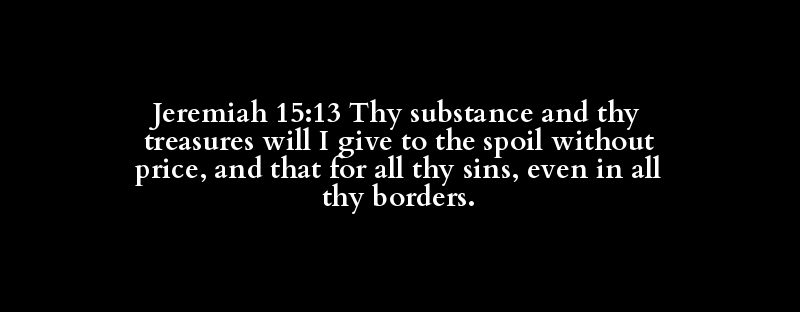 Jeremiah 15:13 Thy substance and thy treasures will I give to the spoil without price, and that for all thy sins, even in all thy borders.