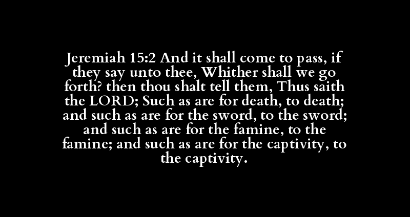 Jeremiah 15:2 And it shall come to pass, if they say unto thee, Whither shall we go forth? then thou shalt tell them, Thus saith the LORD; Such as are for death, to death; and such as are for the sword, to the sword; and such as are for the famine, to the famine; and such as are for the captivity, to the captivity.