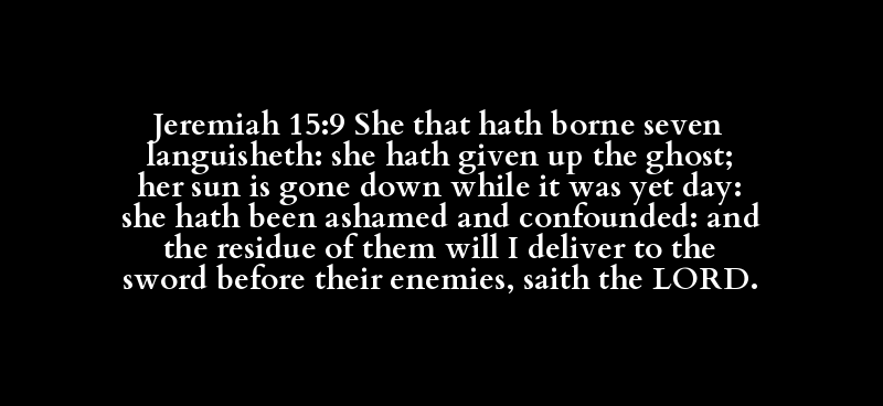Jeremiah 15:9 She that hath borne seven languisheth: she hath given up the ghost; her sun is gone down while it was yet day: she hath been ashamed and confounded: and the residue of them will I deliver to the sword before their enemies, saith the LORD.