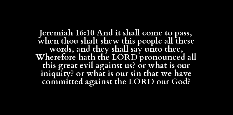 Jeremiah 16:10 And it shall come to pass, when thou shalt shew this people all these words, and they shall say unto thee, Wherefore hath the LORD pronounced all this great evil against us? or what is our iniquity? or what is our sin that we have committed against the LORD our God?