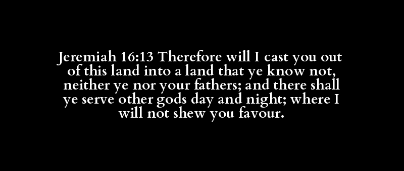 Jeremiah 16:13 Therefore will I cast you out of this land into a land that ye know not, neither ye nor your fathers; and there shall ye serve other gods day and night; where I will not shew you favour.