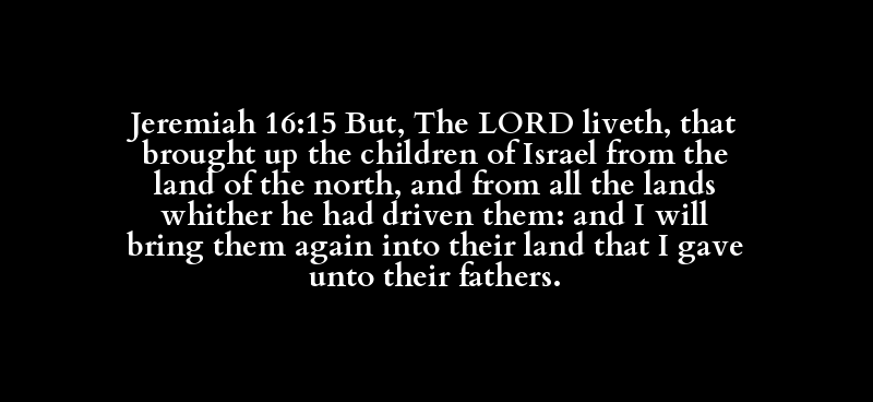 Jeremiah 16:15 But, The LORD liveth, that brought up the children of Israel from the land of the north, and from all the lands whither he had driven them: and I will bring them again into their land that I gave unto their fathers.