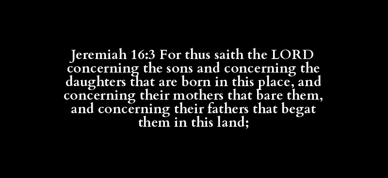 Jeremiah 16:3 For thus saith the LORD concerning the sons and concerning the daughters that are born in this place, and concerning their mothers that bare them, and concerning their fathers that begat them in this land;
