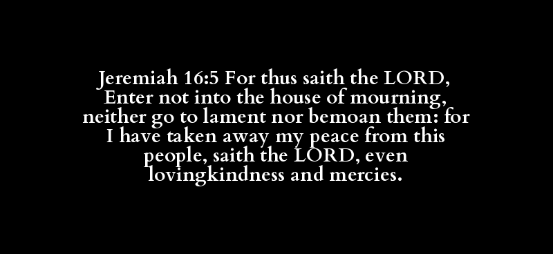 Jeremiah 16:5 For thus saith the LORD, Enter not into the house of mourning, neither go to lament nor bemoan them: for I have taken away my peace from this people, saith the LORD, even lovingkindness and mercies.