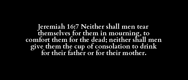 Jeremiah 16:7 Neither shall men tear themselves for them in mourning, to comfort them for the dead; neither shall men give them the cup of consolation to drink for their father or for their mother.