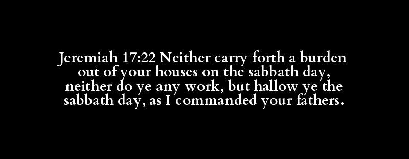 Jeremiah 17:22 Neither carry forth a burden out of your houses on the sabbath day, neither do ye any work, but hallow ye the sabbath day, as I commanded your fathers.