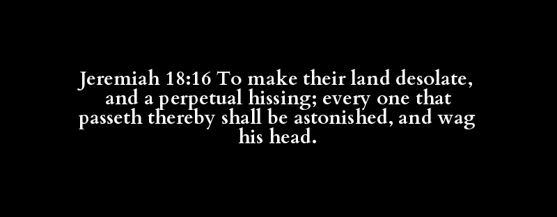 Jeremiah 18:16 To make their land desolate, and a perpetual hissing; every one that passeth thereby shall be astonished, and wag his head.