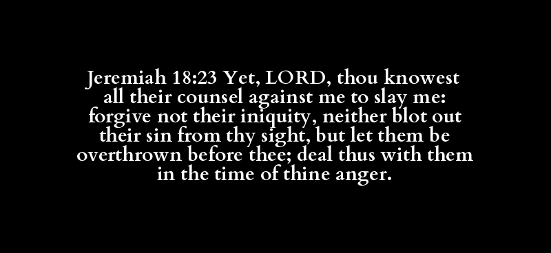 Jeremiah 18:23 Yet, LORD, thou knowest all their counsel against me to slay me: forgive not their iniquity, neither blot out their sin from thy sight, but let them be overthrown before thee; deal thus with them in the time of thine anger.