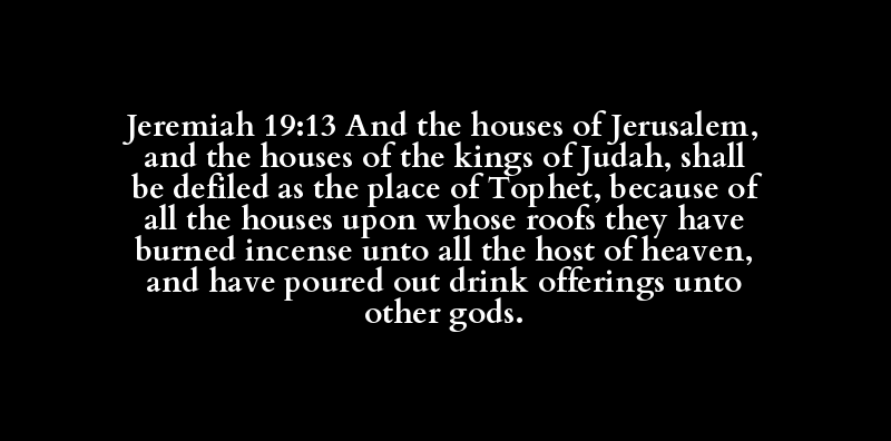 | בַּיִת | יְרוּשָׁלִַם | בַּיִת | מֶלֶךְ | יְהוּדָה | טָמֵא | מָקוֹם | תֹּפֶת | בַּיִת | גָּג | קָטַר | צָבָא | שָׁמַיִם | נָסַךְ | נֶסֶךְ | אַחֵר | אֱלֹהִים |