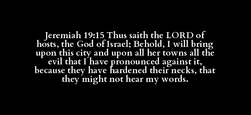 Jeremiah 19:15 Thus saith the LORD of hosts, the God of Israel; Behold, I will bring upon this city and upon all her towns all the evil that I have pronounced against it, because they have hardened their necks, that they might not hear my words.