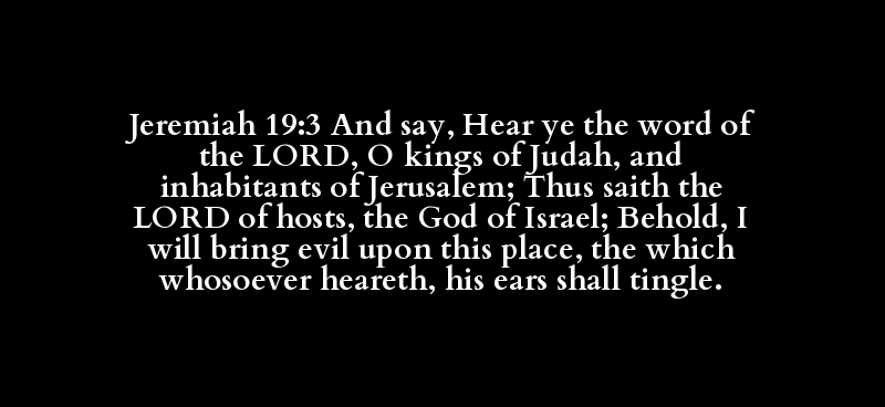 Jeremiah 19:3 And say, Hear ye the word of the LORD, O kings of Judah, and inhabitants of Jerusalem; Thus saith the LORD of hosts, the God of Israel; Behold, I will bring evil upon this place, the which whosoever heareth, his ears shall tingle.