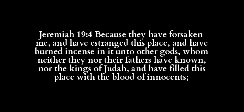 Jeremiah 19:4 Because they have forsaken me, and have estranged this place, and have burned incense in it unto other gods, whom neither they nor their fathers have known, nor the kings of Judah, and have filled this place with the blood of innocents;