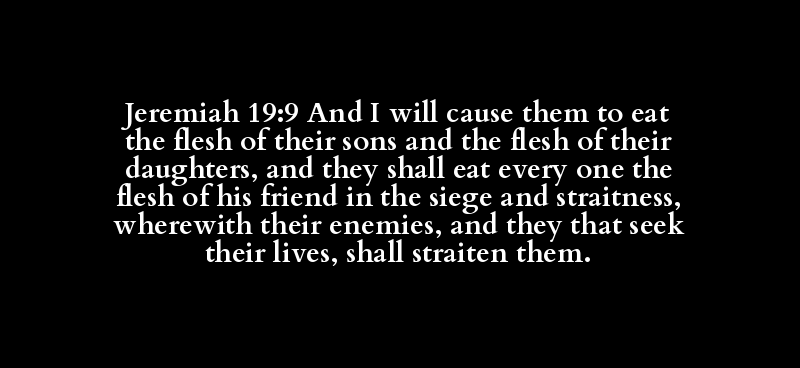 Jeremiah 19:9 And I will cause them to eat the flesh of their sons and the flesh of their daughters, and they shall eat every one the flesh of his friend in the siege and straitness, wherewith their enemies, and they that seek their lives, shall straiten them.