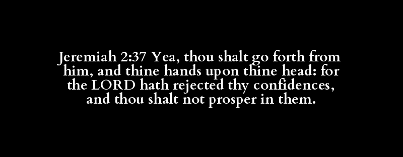 Jeremiah 2:37 Yea, thou shalt go forth from him, and thine hands upon thine head: for the LORD hath rejected thy confidences, and thou shalt not prosper in them.
