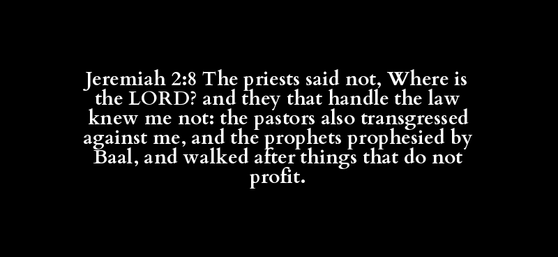 Jeremiah 2:8 The priests said not, Where is the LORD? and they that handle the law knew me not: the pastors also transgressed against me, and the prophets prophesied by Baal, and walked after things that do not profit.