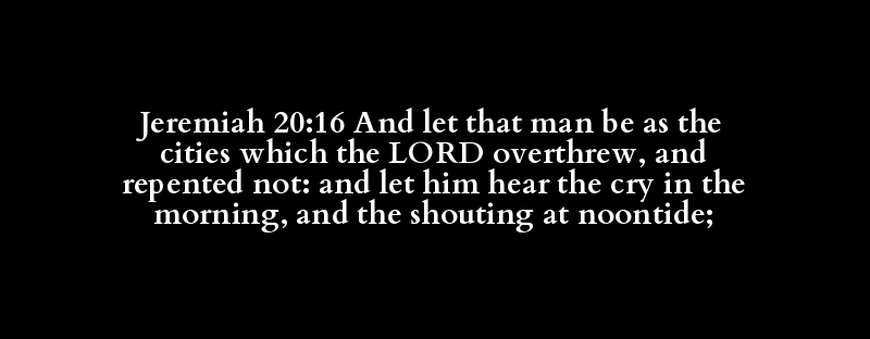 Jeremiah 20:16 And let that man be as the cities which the LORD overthrew, and repented not: and let him hear the cry in the morning, and the shouting at noontide;
