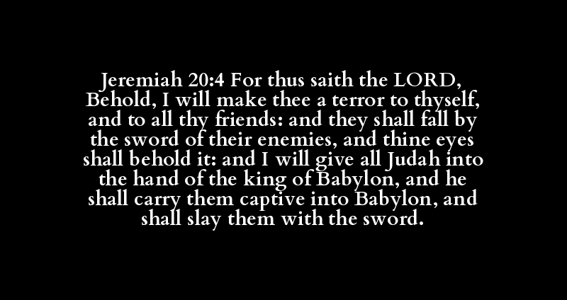 Jeremiah 20:4 For thus saith the LORD, Behold, I will make thee a terror to thyself, and to all thy friends: and they shall fall by the sword of their enemies, and thine eyes shall behold it: and I will give all Judah into the hand of the king of Babylon, and he shall carry them captive into Babylon, and shall slay them with the sword.