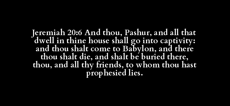 Jeremiah 20:6 And thou, Pashur, and all that dwell in thine house shall go into captivity: and thou shalt come to Babylon, and there thou shalt die, and shalt be buried there, thou, and all thy friends, to whom thou hast prophesied lies.