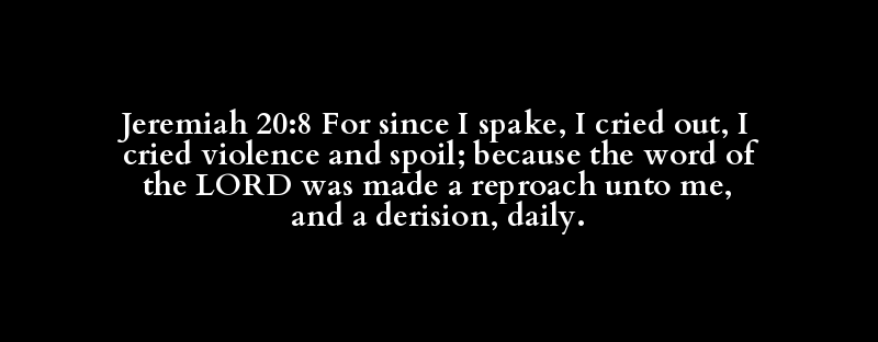 Jeremiah 20:8 For since I spake, I cried out, I cried violence and spoil; because the word of the LORD was made a reproach unto me, and a derision, daily.