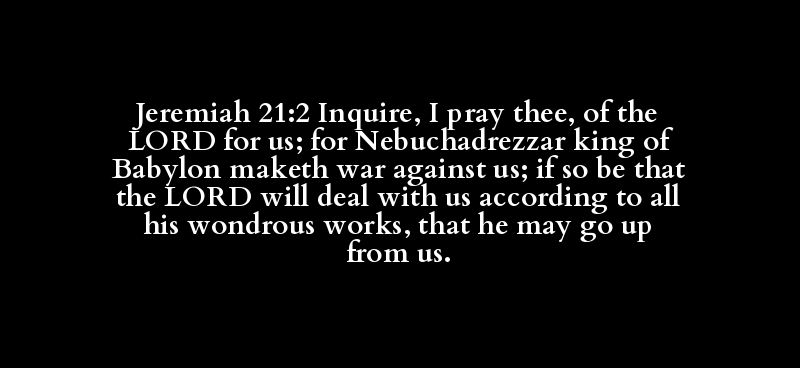 Jeremiah 21:2 Inquire, I pray thee, of the LORD for us; for Nebuchadrezzar king of Babylon maketh war against us; if so be that the LORD will deal with us according to all his wondrous works, that he may go up from us.