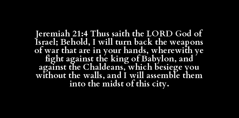 Jeremiah 21:4 Thus saith the LORD God of Israel; Behold, I will turn back the weapons of war that are in your hands, wherewith ye fight against the king of Babylon, and against the Chaldeans, which besiege you without the walls, and I will assemble them into the midst of this city.