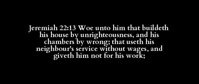 Jeremiah 22:13 Woe unto him that buildeth his house by unrighteousness, and his chambers by wrong; that useth his neighbour's service without wages, and giveth him not for his work;