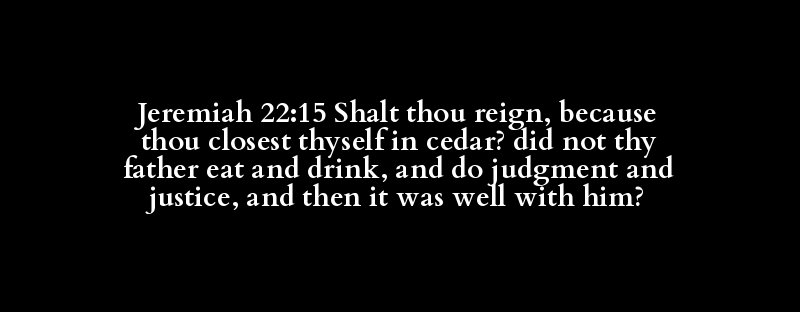 Jeremiah 22:15 Shalt thou reign, because thou closest thyself in cedar? did not thy father eat and drink, and do judgment and justice, and then it was well with him?