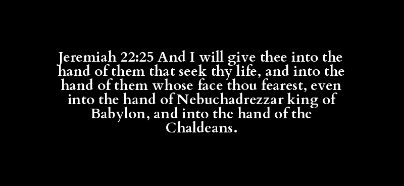 Jeremiah 22:25 And I will give thee into the hand of them that seek thy life, and into the hand of them whose face thou fearest, even into the hand of Nebuchadrezzar king of Babylon, and into the hand of the Chaldeans.