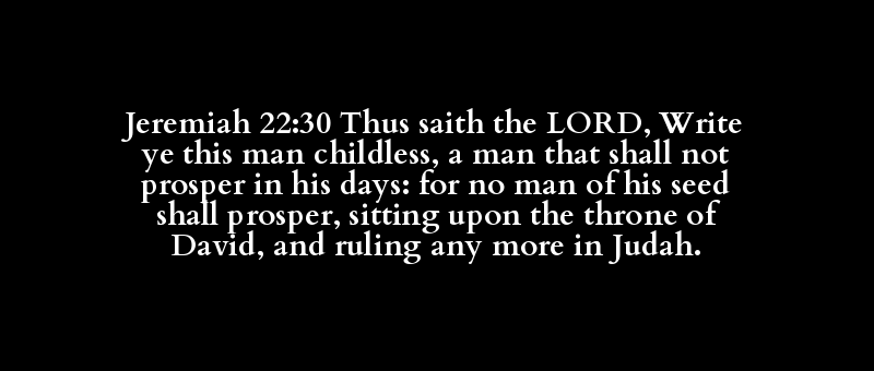 Jeremiah 22:30 Thus saith the LORD, Write ye this man childless, a man that shall not prosper in his days: for no man of his seed shall prosper, sitting upon the throne of David, and ruling any more in Judah.