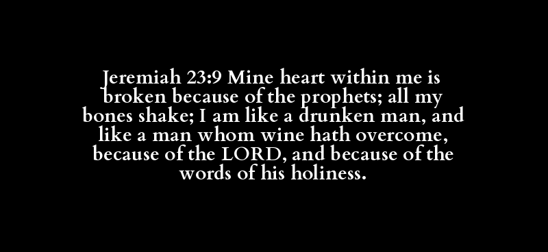 Jeremiah 23:9 Mine heart within me is broken because of the prophets; all my bones shake; I am like a drunken man, and like a man whom wine hath overcome, because of the LORD, and because of the words of his holiness.