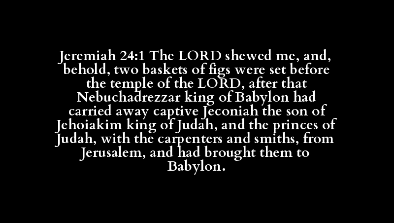 Jeremiah 24:1 The LORD shewed me, and, behold, two baskets of figs were set before the temple of the LORD, after that Nebuchadrezzar king of Babylon had carried away captive Jeconiah the son of Jehoiakim king of Judah, and the princes of Judah, with the carpenters and smiths, from Jerusalem, and had brought them to Babylon.