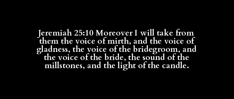 | אָבַד | קוֹל | שָׂשׂוֹן | קוֹל | שִׂמְחָה | קוֹל | חָתָן | קוֹל | כַּלָּה | קוֹל | רֵחֶה | אוֹר | נִיר |