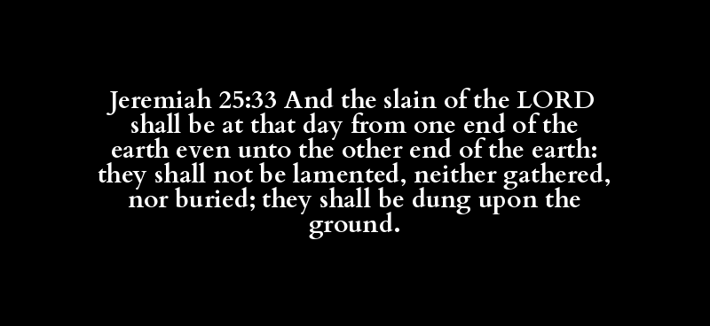 Jeremiah 25:33 And the slain of the LORD shall be at that day from one end of the earth even unto the other end of the earth: they shall not be lamented, neither gathered, nor buried; they shall be dung upon the ground.
