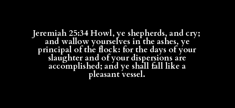 Jeremiah 25:34 Howl, ye shepherds, and cry; and wallow yourselves in the ashes, ye principal of the flock: for the days of your slaughter and of your dispersions are accomplished; and ye shall fall like a pleasant vessel.