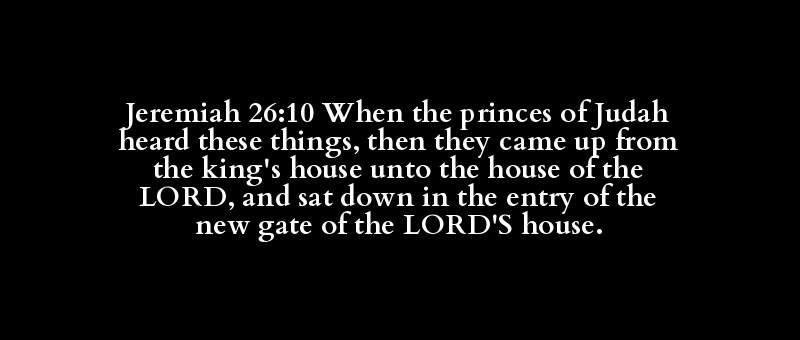Jeremiah 26:10 When the princes of Judah heard these things, then they came up from the king's house unto the house of the LORD, and sat down in the entry of the new gate of the LORD'S house.