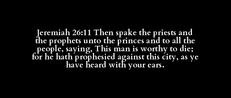 Jeremiah 26:11 Then spake the priests and the prophets unto the princes and to all the people, saying, This man is worthy to die; for he hath prophesied against this city, as ye have heard with your ears.