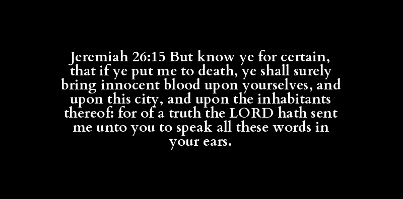 Jeremiah 26:15 But know ye for certain, that if ye put me to death, ye shall surely bring innocent blood upon yourselves, and upon this city, and upon the inhabitants thereof: for of a truth the LORD hath sent me unto you to speak all these words in your ears.