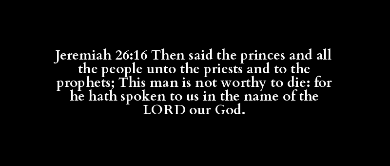 Jeremiah 26:16 Then said the princes and all the people unto the priests and to the prophets; This man is not worthy to die: for he hath spoken to us in the name of the LORD our God.
