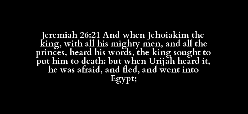 Jeremiah 26:21 And when Jehoiakim the king, with all his mighty men, and all the princes, heard his words, the king sought to put him to death: but when Urijah heard it, he was afraid, and fled, and went into Egypt;