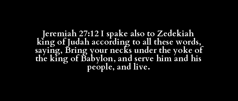 Jeremiah 27:12 I spake also to Zedekiah king of Judah according to all these words, saying, Bring your necks under the yoke of the king of Babylon, and serve him and his people, and live.