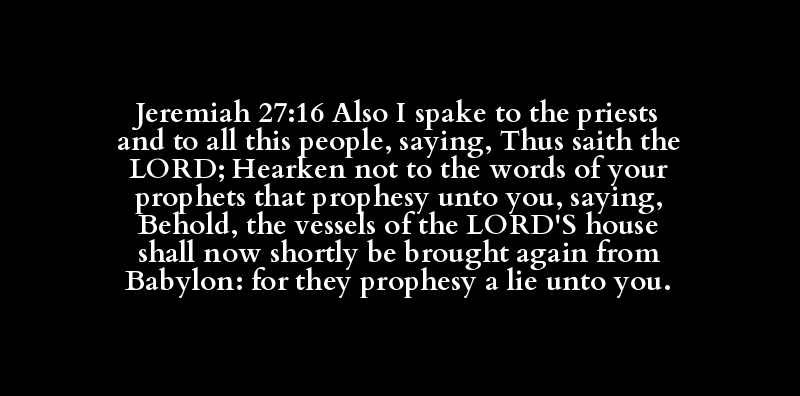 Jeremiah 27:16 Also I spake to the priests and to all this people, saying, Thus saith the LORD; Hearken not to the words of your prophets that prophesy unto you, saying, Behold, the vessels of the LORD'S house shall now shortly be brought again from Babylon: for they prophesy a lie unto you.