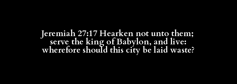Jeremiah 27:17 Hearken not unto them; serve the king of Babylon, and live: wherefore should this city be laid waste?
