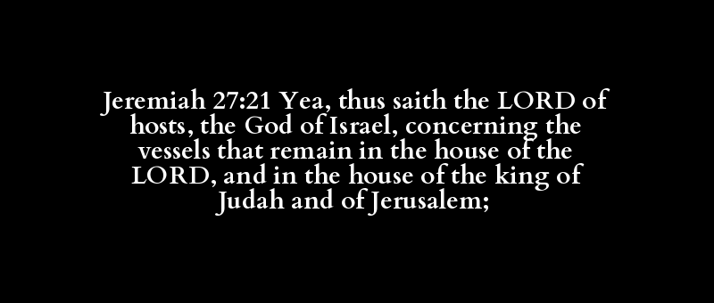 Jeremiah 27:21 Yea, thus saith the LORD of hosts, the God of Israel, concerning the vessels that remain in the house of the LORD, and in the house of the king of Judah and of Jerusalem;