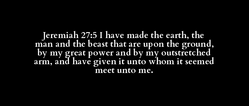 Jeremiah 27:5 I have made the earth, the man and the beast that are upon the ground, by my great power and by my outstretched arm, and have given it unto whom it seemed meet unto me.