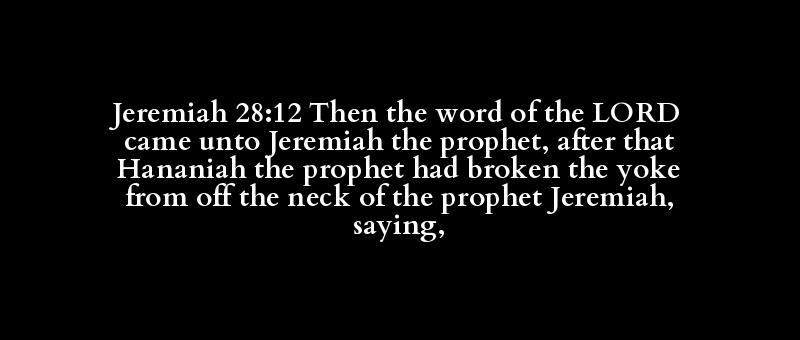 Jeremiah 28:12 Then the word of the LORD came unto Jeremiah the prophet, after that Hananiah the prophet had broken the yoke from off the neck of the prophet Jeremiah, saying,